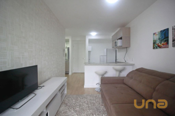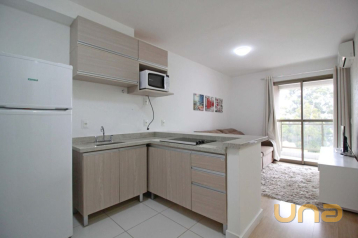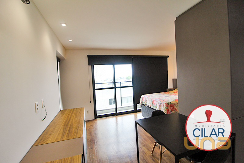 01 Quarto conjugado com a cozinha com 01 cama box, 01 mesa de estudos, 01 cômoda, 01 mesa com 02 cadeiras, cortina;