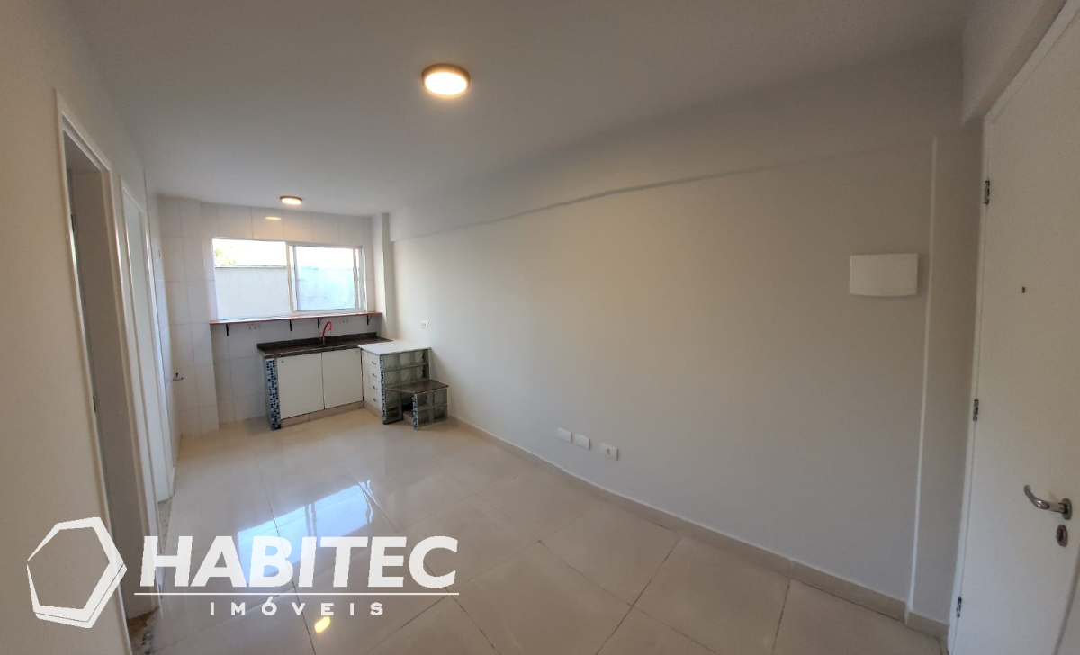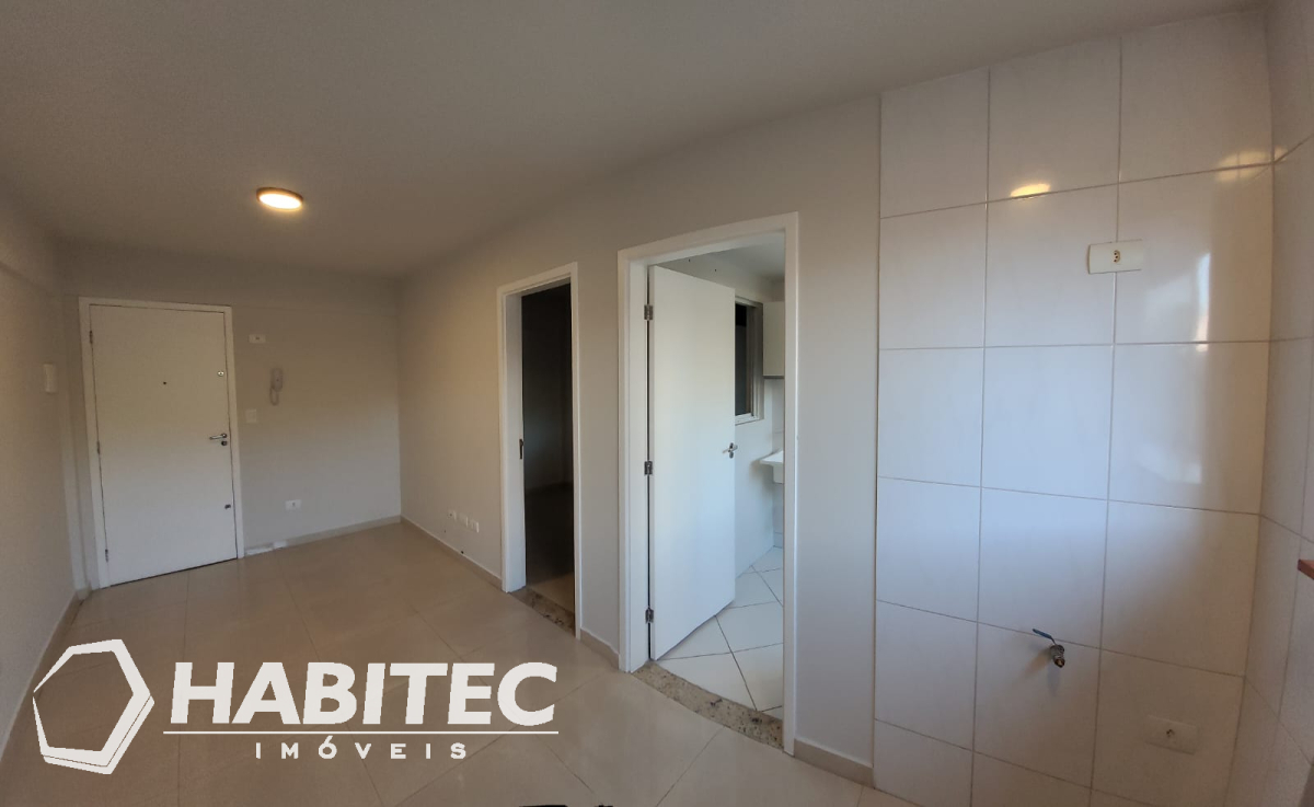 Apartamento de 1 dormitório conta com suíte e armário planejado. A sala é integrada à cozinha, que possui pia com armário, proporcionando praticidade e aproveitamento de espaço. Há ainda uma ampla lavanderia separada, equipada com armários, oferecendo mais comodidade no dia a dia.