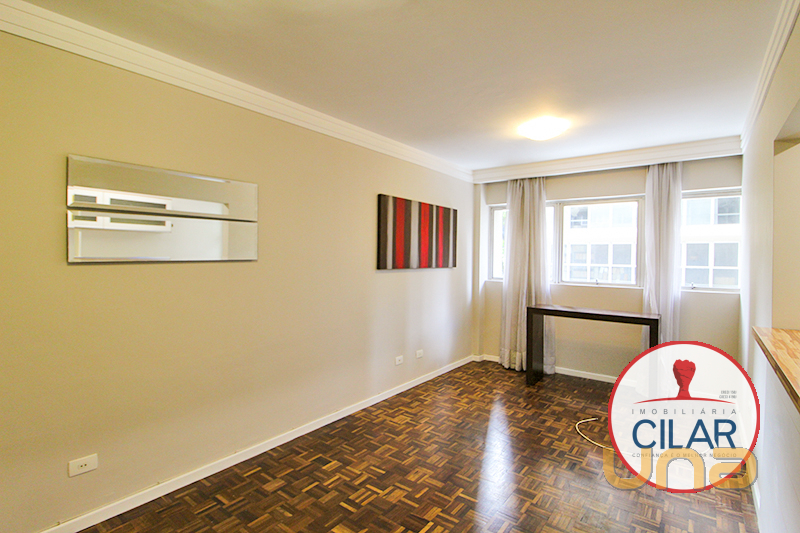 Sala de estar com piso parquet, sancas em gesso, cortinas e lavabo;