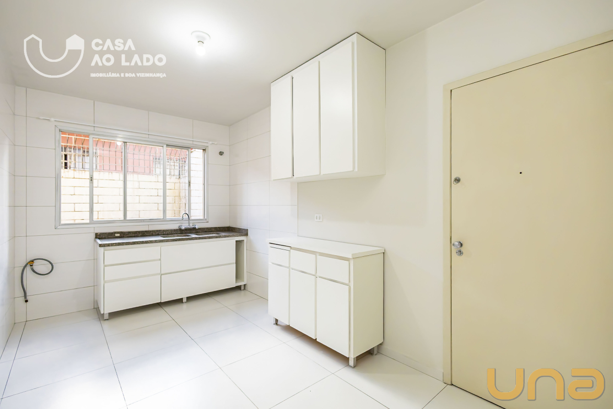 Sala para dois ambientes (estar e jantar), cozinha equipada com armários dando acesso á lavanderia, e banheiro social.