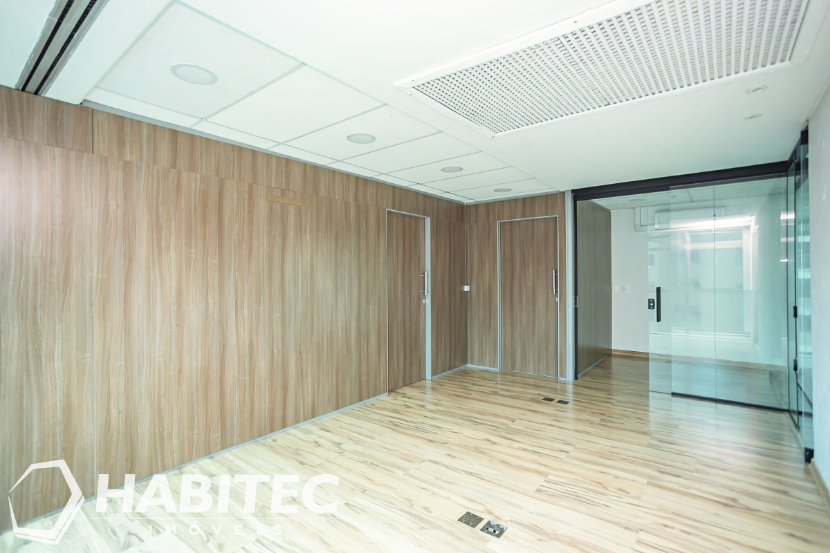 Com área privativa de 147m² e área total de 181,11m², o espaço conta com uma sala ampla em vão livre, duas salas com divisórias interligadas – sendo uma delas com banheiro privativo, além de uma sala com divisória de vidro e recepção com porta de vidro. Dispõe ainda de dois lavabos, uma copa, piso laminado e ar-condicionado instalado, garantindo conforto e praticidade.