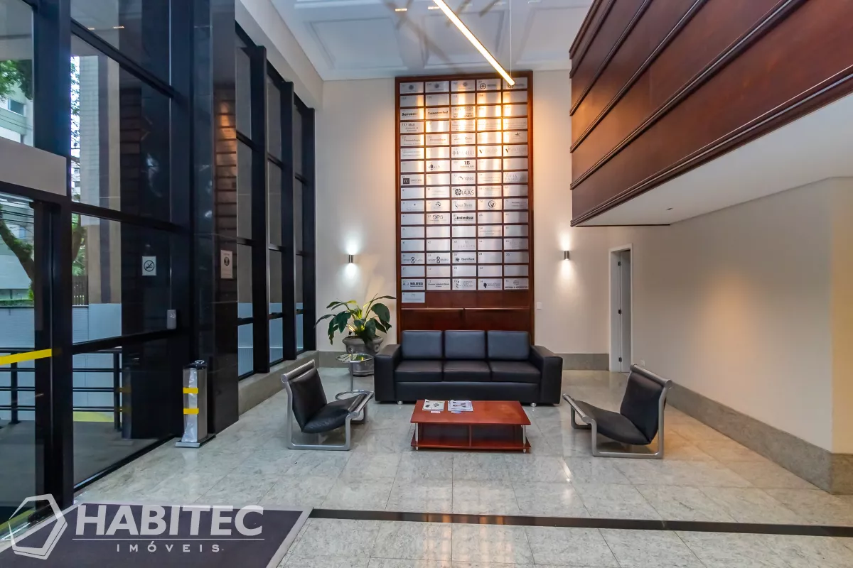 Excelente conjunto comercial, localização nobre, com piso laminado, sala ampla com divisória , porta de vidro, luminárias, persianas, armários, copa.