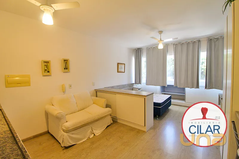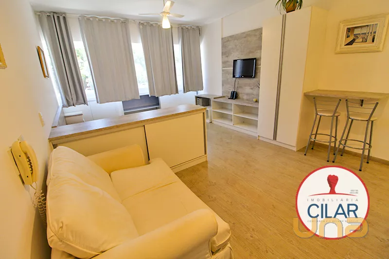 Cozinha com mesa e 2 banquetas, frigobar, micro-ondas, armários e pia tampo granito; Banheiro com pia tampo granito, box blindex e aquecimento a gás.
