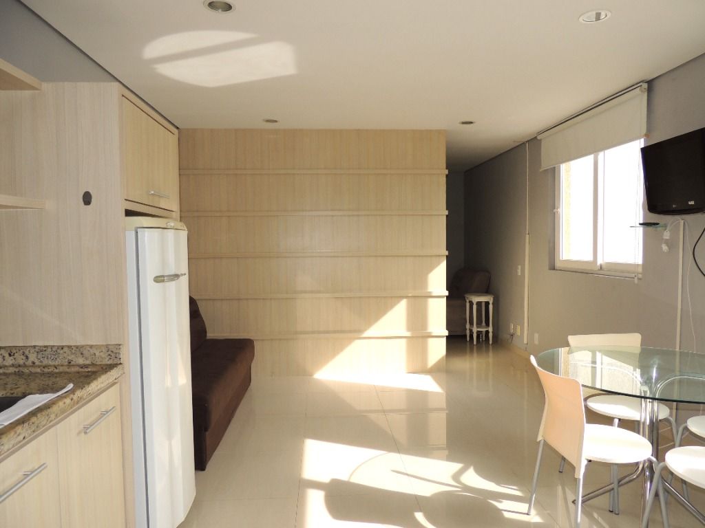 Imóvel todo mobiliado, com geladeira, fogão cooktop, microondas, TV e máquina de lavar roupa. Lavanderia coletiva.