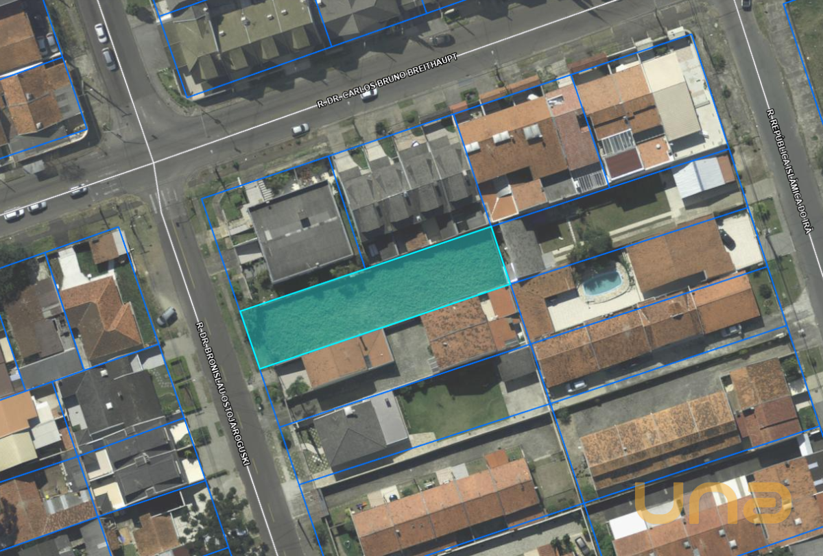 Terreno com 600 m² de área total, com testada de 12 m de frente e 50 m de fundos, na Rua Doutor Bronislau Ostoja Roguski, entre as Ruas João Ribeiro e Rua República Islâmica do Irã, a poucos metros da Rua Doutor Carlos Bruno Breithaupt.