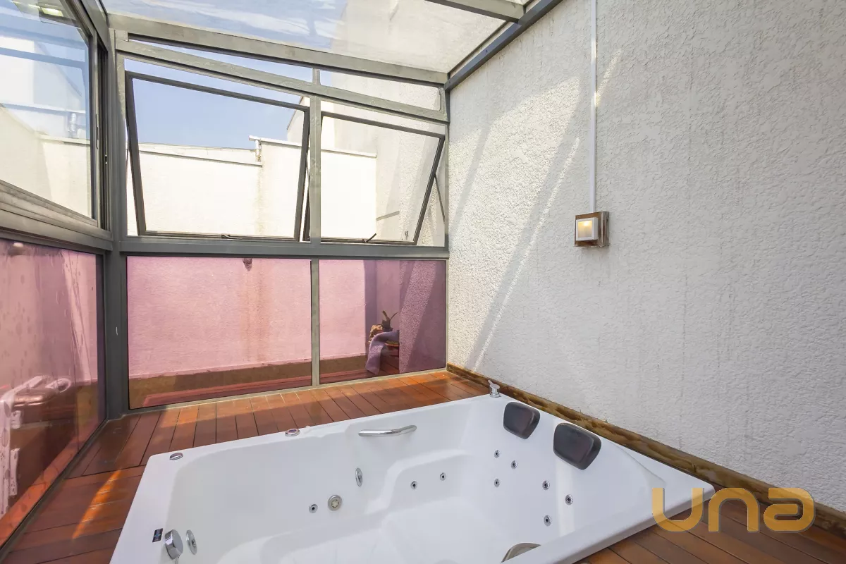 No segundo piso contamos com cozinha gourmet integrada com churrasqueira, sala de tv, uma ampla sala de jantar com bar, espaço de depósito, e ainda conta com uma hidromassagem privativa com cobertura de vidro e terraço descoberto.