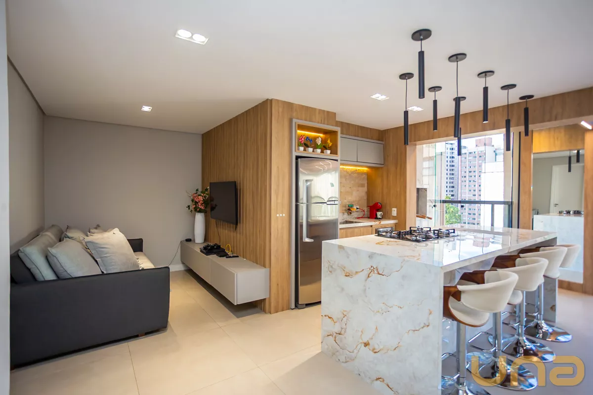 A sala de estar é ampla e elegante, com marcenaria planejada, piso em porcelanato e iluminação embutida em LED.