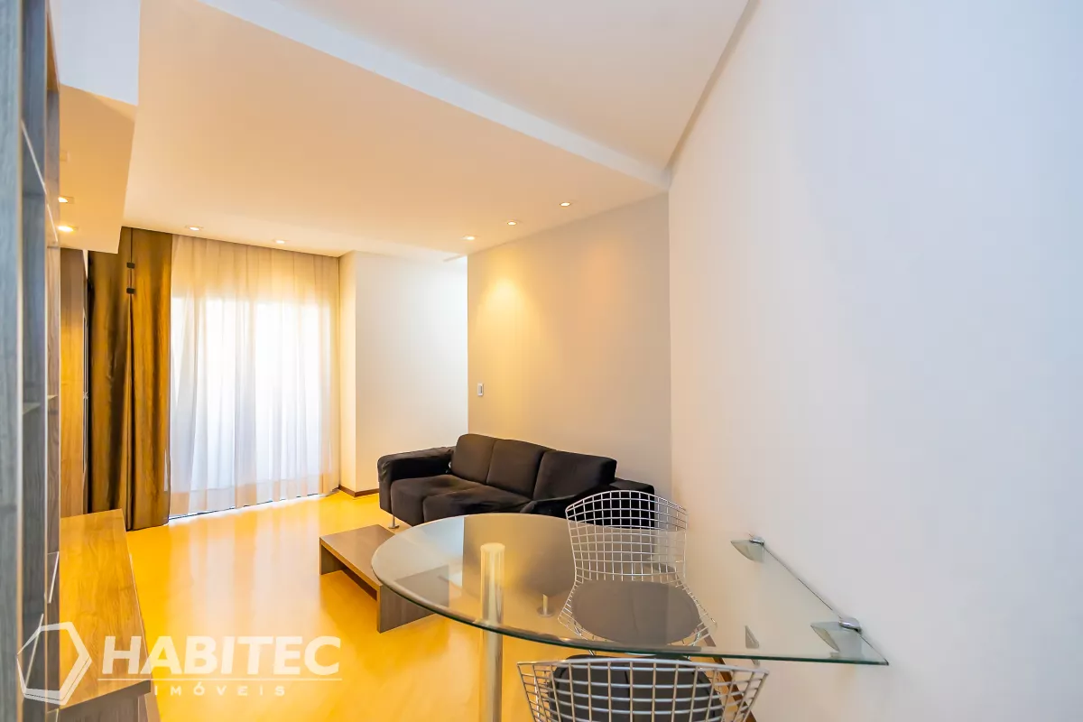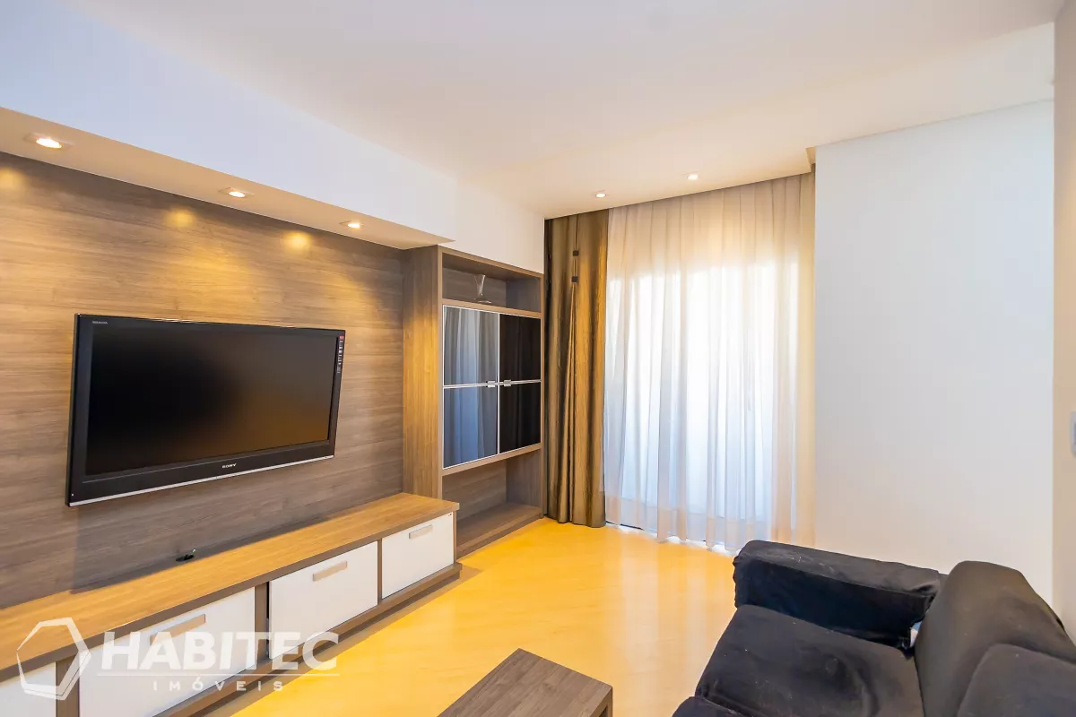 Sala ampla para dois ambientes com painel para TV, Sacada fechada com churrasqueira,