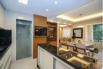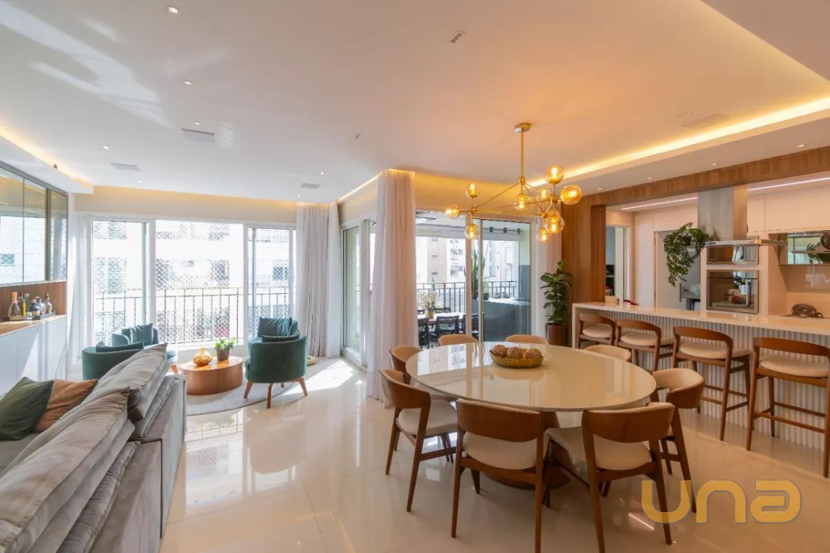O apartamento dispõe de uma ampla sala de estar integrada à sala de jantar e à cozinha em conceito aberto. Conta ainda com espaço de churrasqueira, ideal para receber amigos ou desfrutar de momentos de lazer e descanso com a família.