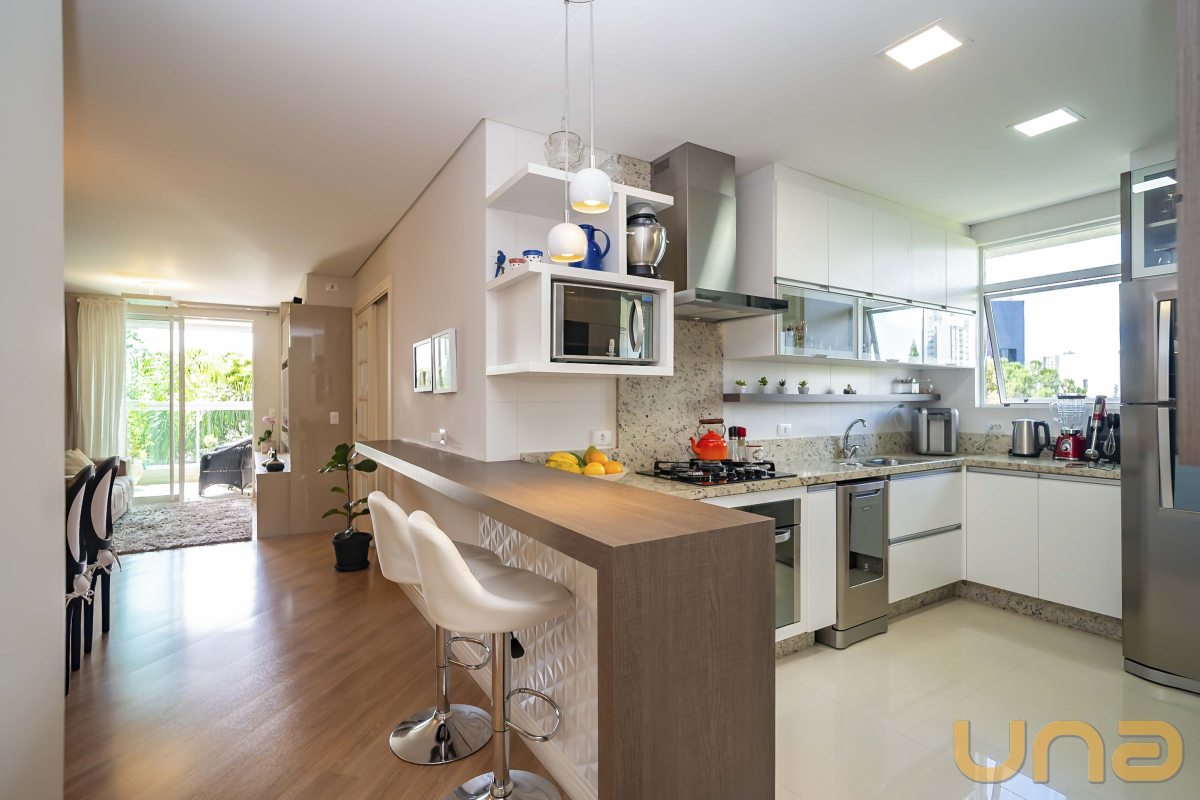 Cozinha estilo americano, com parte integrada à sala, e área de serviço muito funcional.