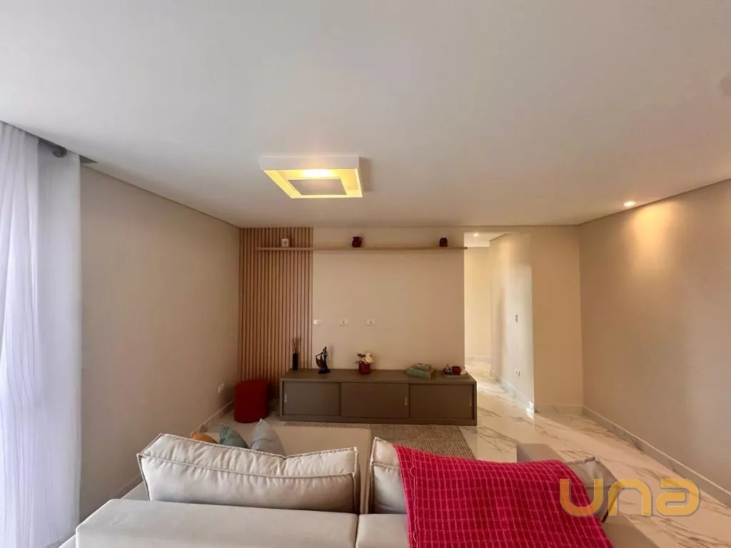 * Sala de dois ambientes e cozinha integrada, com sacada dispondo de churrasqueira e piso em porcelanato;