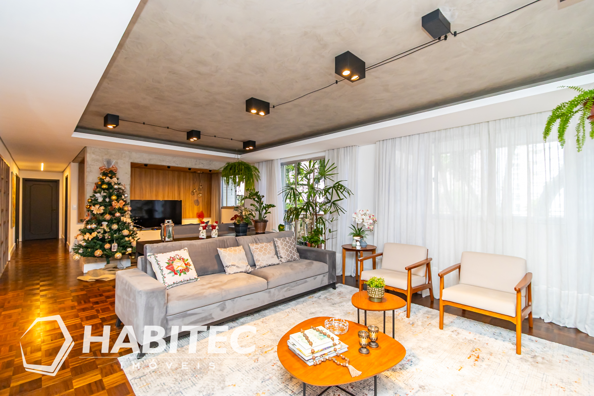 O apartamento amplo, com área total de 257,12m² sendo 186,71m² de área útil, totalmente reformado e decorado com excelente padrão de acabamento, ensolarado e face leste.