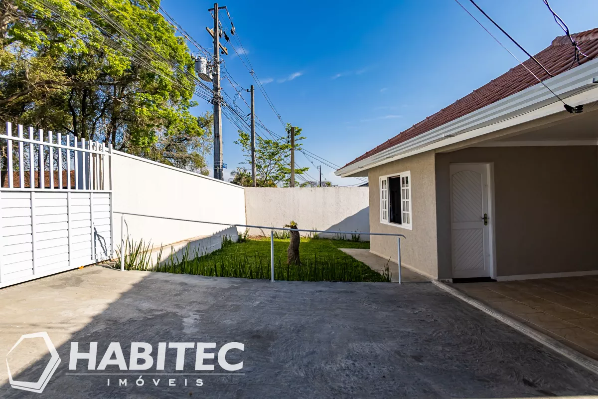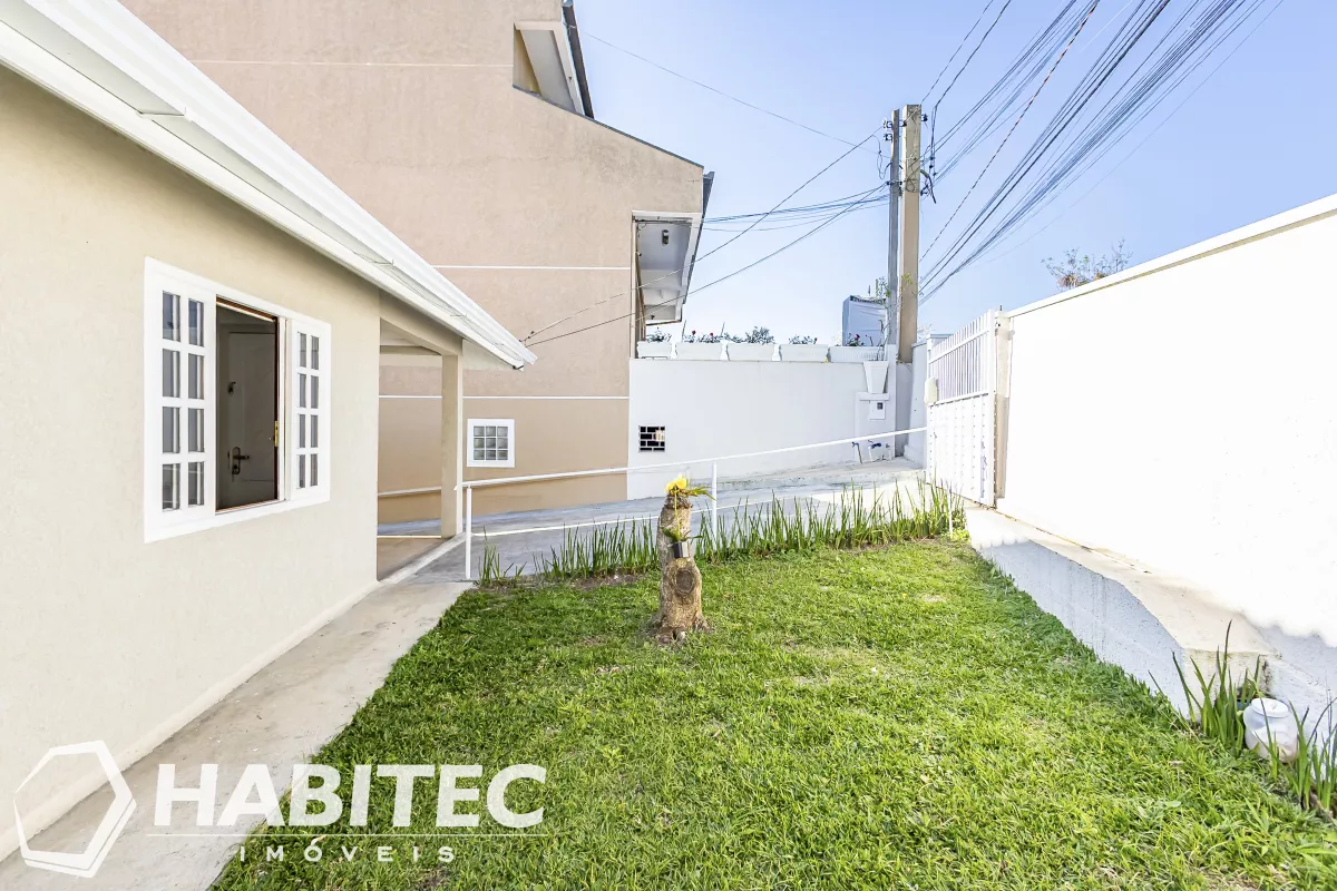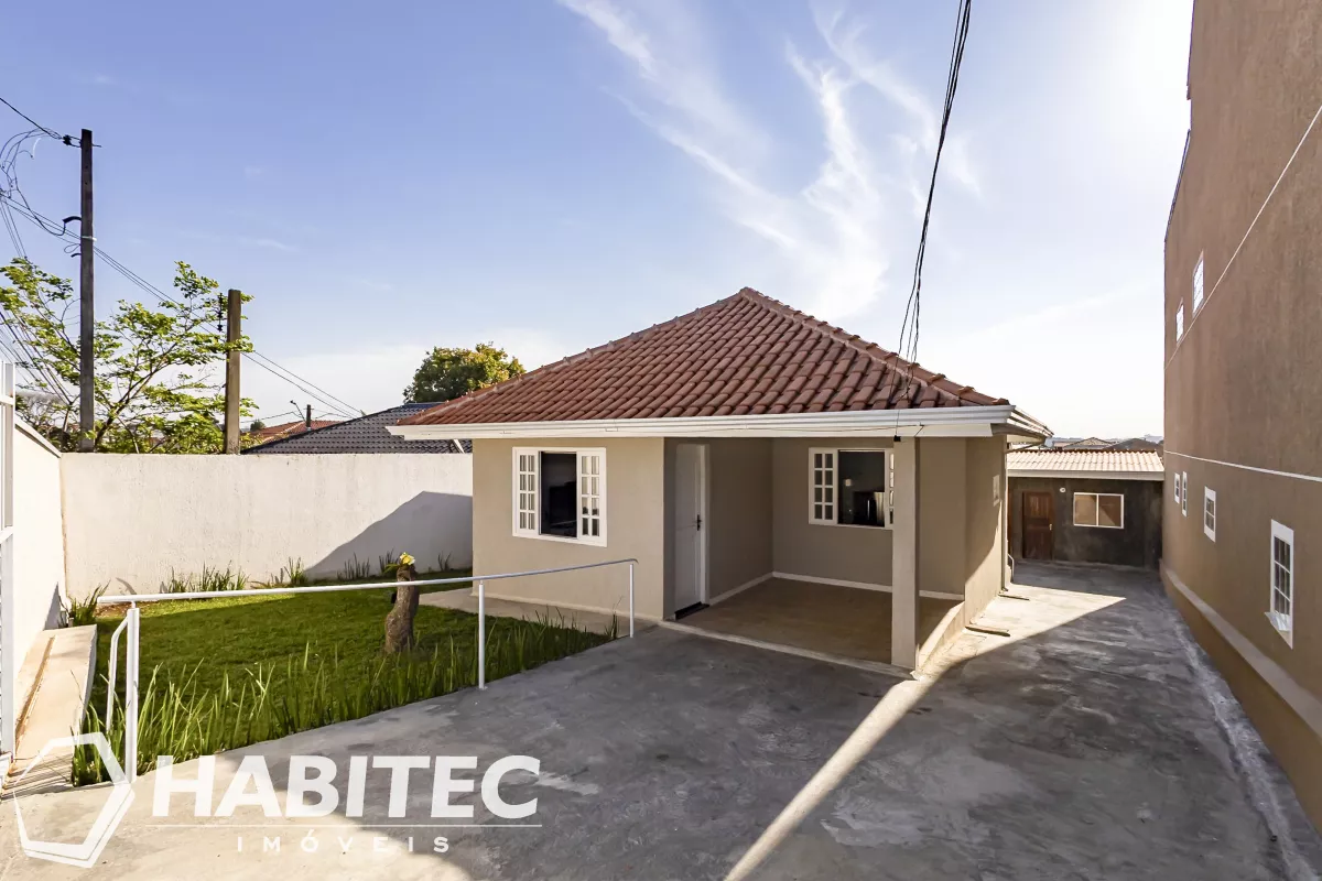 A casa tem cerca de 67m². Com 2 quartos, banheiro, sala de estar, sala de jantar integrada com a cozinha com armários e bancada em granito, e área de serviço. A edícula possui um quarto, banheiro e cozinha, com aproximadamente 20m².