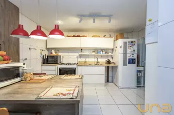 Ambientes Sociais e de Serviço: Sala de estar e sala de jantar com piso de porcelanato, cozinha ampla com armários embutidos, lavabo, área de serviço separada e área gourmet com churrasqueira a carvão e piscina aquecida.