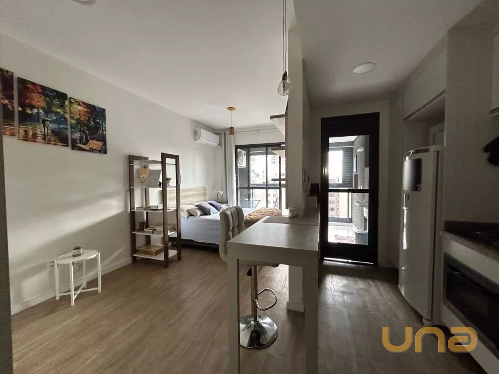 Studio com 37 metros de área útil, sacada com churrasqueira, mobiliado.