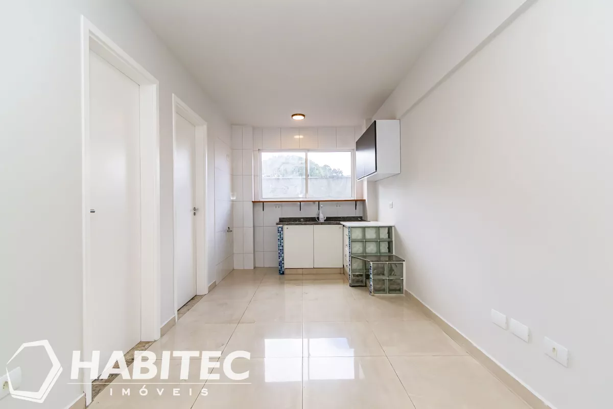 Apartamento de 1 dormitório conta com suíte e armário planejado. A sala é integrada à cozinha, que possui pia com armário, proporcionando praticidade e aproveitamento de espaço. Há ainda uma ampla lavanderia separada, equipada com armários, oferecendo mais comodidade no dia a dia.